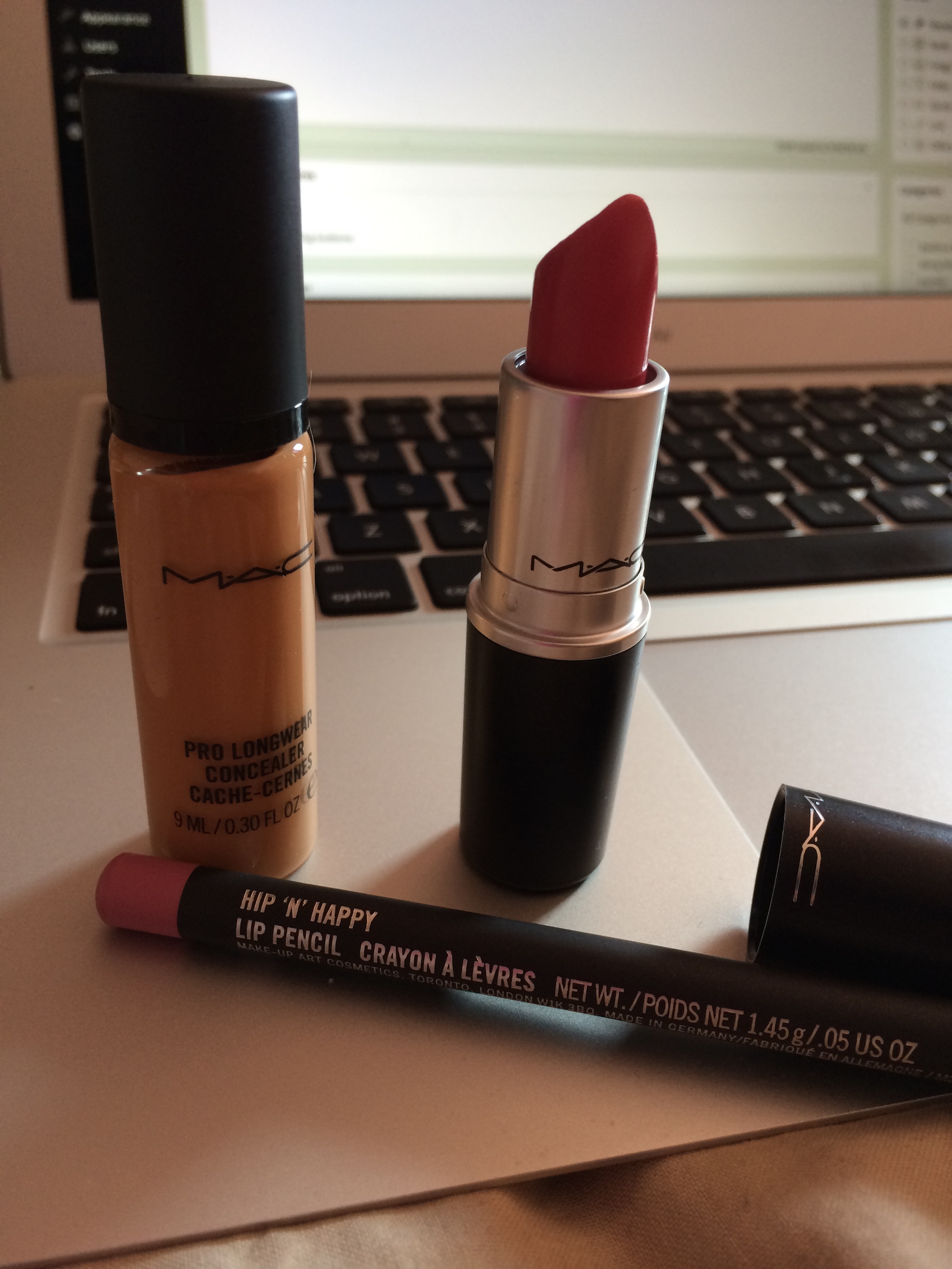 With new phone in hand with less than 10% charge I did do a bit of shopping…yes, I stopped at MAC… I only bought 3 things this time, so I did demonstrate some kind of restraint, although I DID only intend on buying 1 thing heehee I bought more Pro Longwear Concealer, a lip pencil in “Hip ‘n’ Happy” and an Amplified lipstick in “Chatterbox”. Just the names alone make me laugh because, well it kind of describes how I’ve been feeling lately.