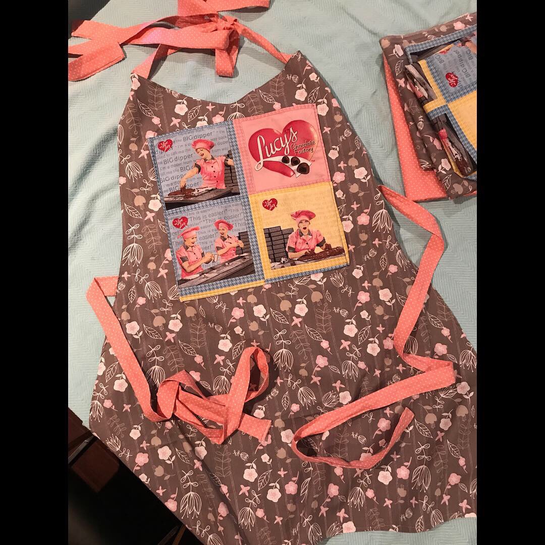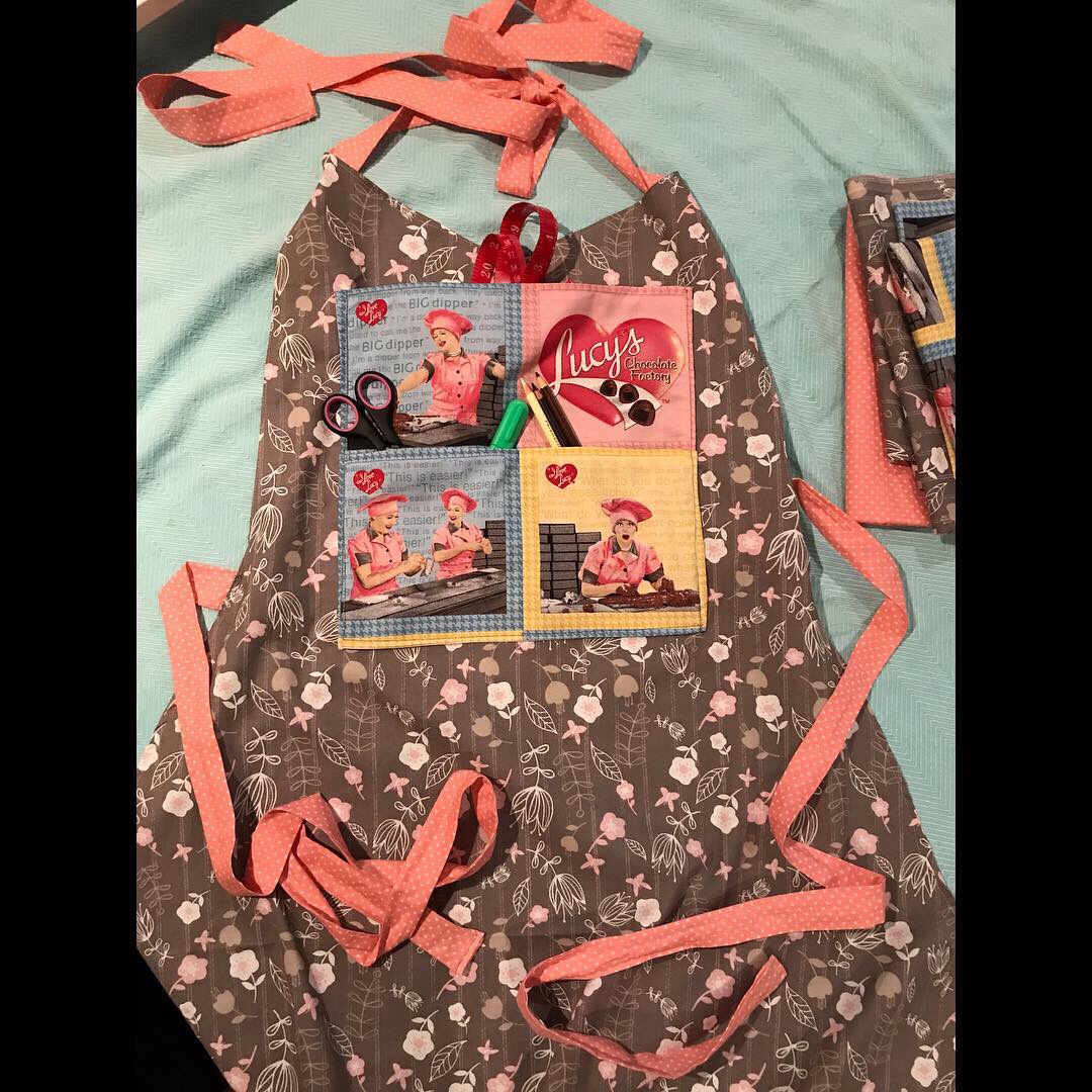 I found it on the bottom shelf tucked in behind some other unrelated fabric. Not only is this my favourite I Love Lucy episode, the colours are gorgeous retro shades. I immediately thought about making an apron for my doll painting and other crafts. I gathered my focal fabric and some cute complimentary and contrast fabrics to give it a modern day/vintage look.